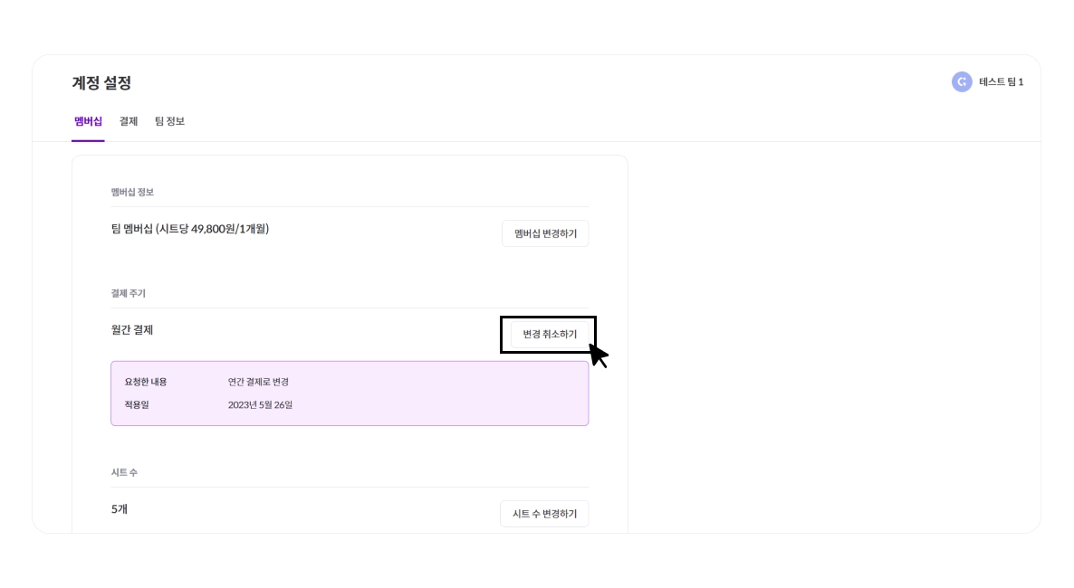 변경 취소하기 버튼을 클릭하여 결제 주기 변경을 취소할 수 있습니다