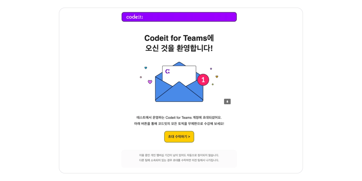 코드잇에 회원가입하지 않은 계정으로 초대하는 경우, 초대를 받은 수강생은 회원가입 후 팀에 참여할 수 있습니다.