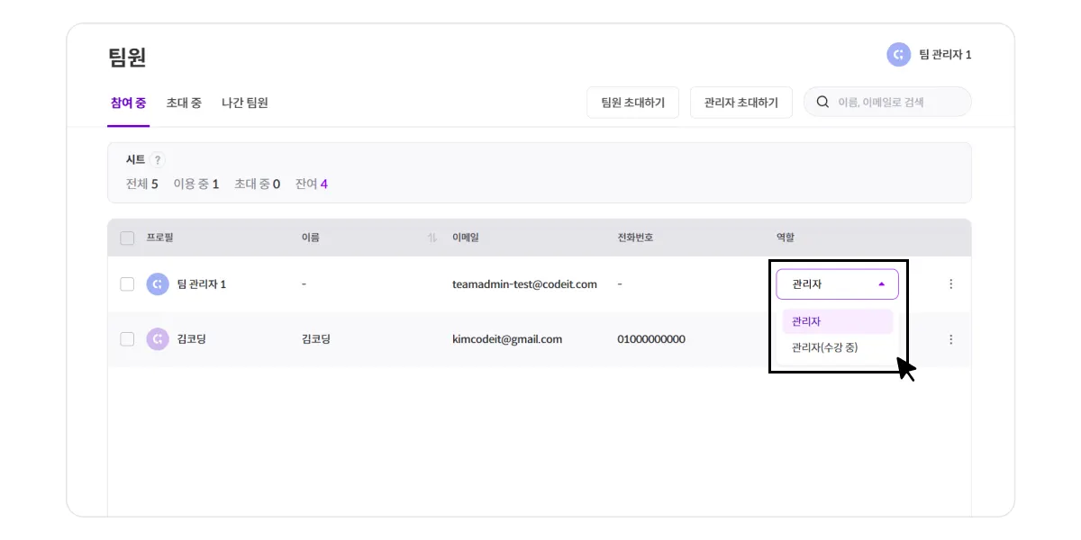 팀에 참여하는 팀원의 권한은 크게 관리자와 수강생으로 구분됩니다.