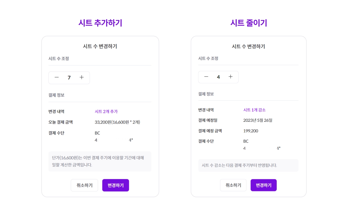 시트 수를 줄이는 경우 변경한 내용(시트 수와 결제 금액)은 다음 결제일부터 반영됩니다.