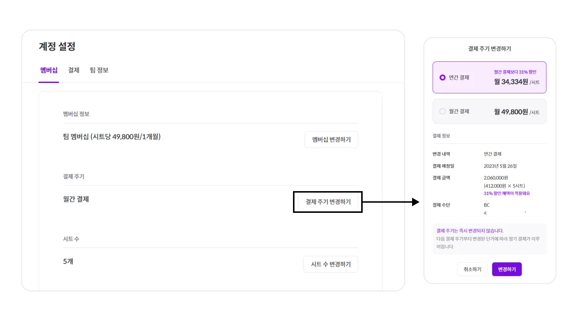 변경 취소하기 버튼을 클릭하여 결제 주기 변경을 취소할 수 있습니다