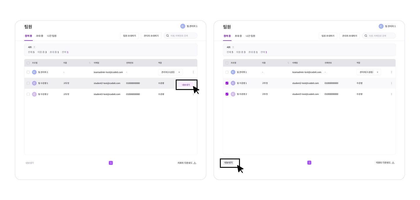 (일괄로 내보내기) 내보낼 팀원을을 체크박스로 선택합니다.